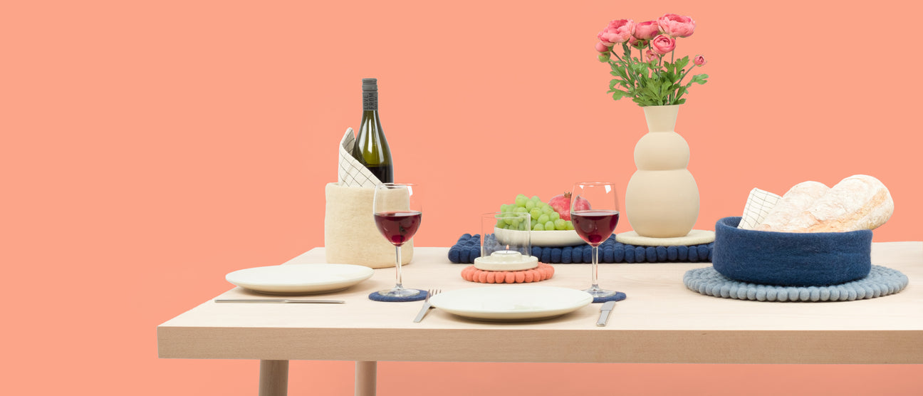Små tilbehør fra myfelt former subtilt atmosfæren i spisestuen. De højkvalitets gryde- og glasskånere i mange forskellige udgaver bringer ikke kun dejlig farve til bordet, men viser sig også at være særdeles funktionelle og holdbare. myfelt Coasters er lavet af ren ny uld og beskytter følsomme overflader som træ og glas mod pletter og ridser.