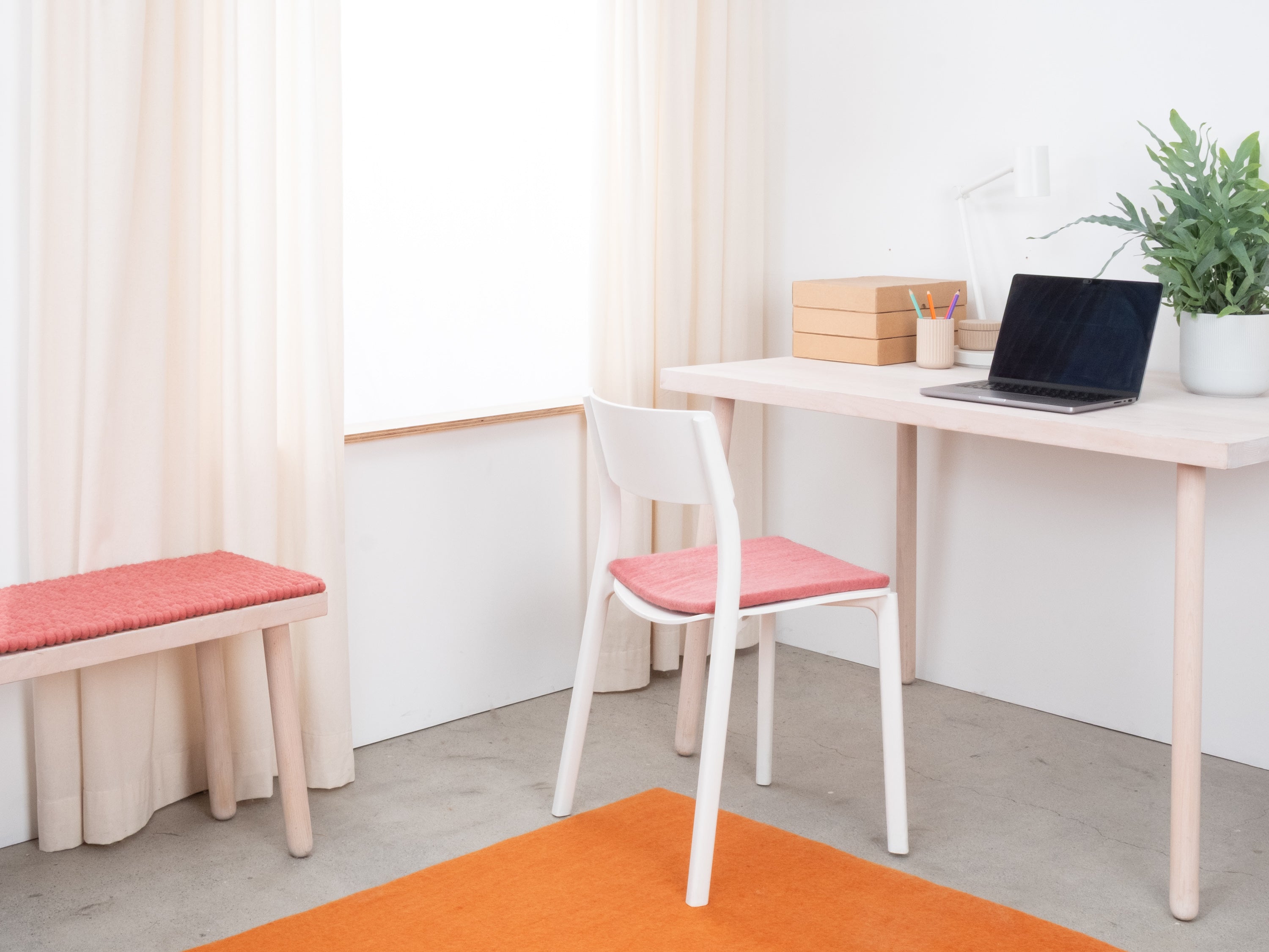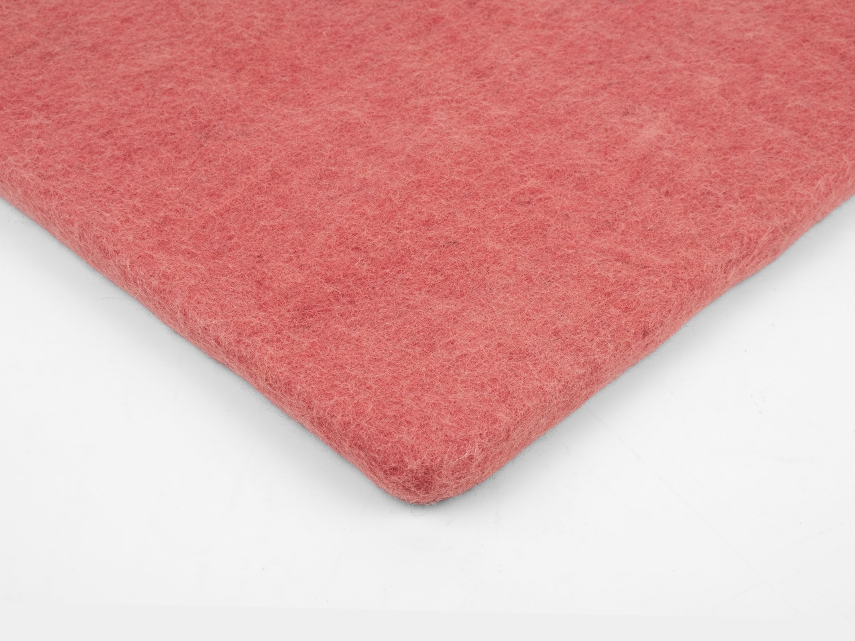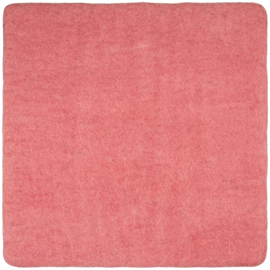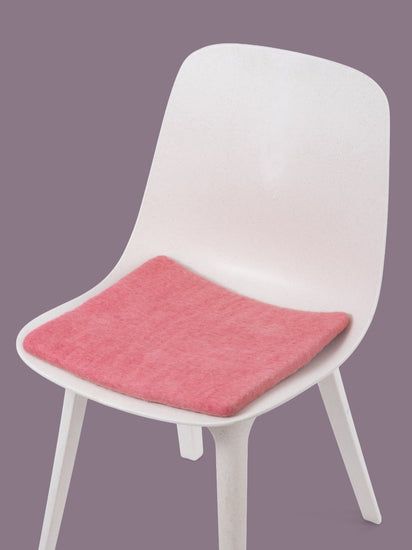 Firkantede, koralfarvede flade sædeunderlag af ren ny uld.