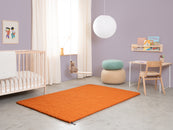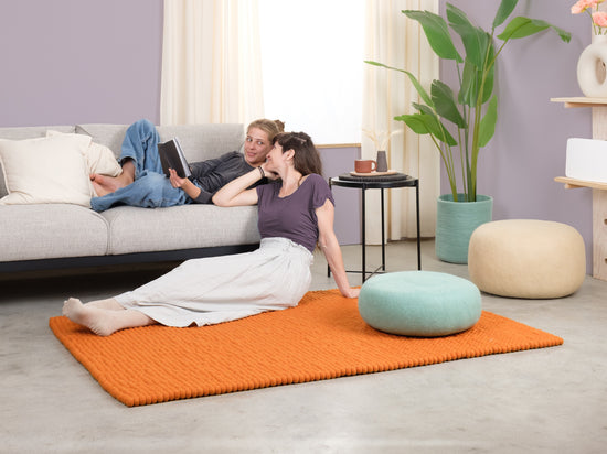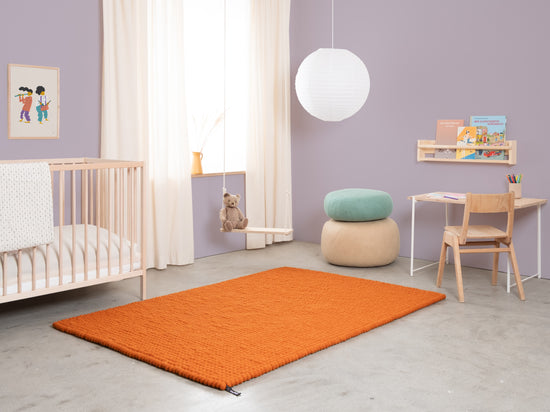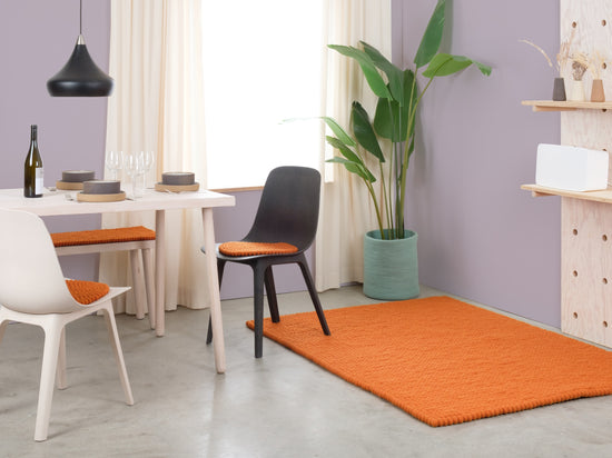 Afra bringer en varm orange ind i rummet. Indbydende og energisk uden at blive dominerende. Perfekt til at varme kølige rum op eller sætte accenter. Robust, let at pleje og behageligt under fødderne. Håndlavet i Nepal – af 100 % ren ny uld.