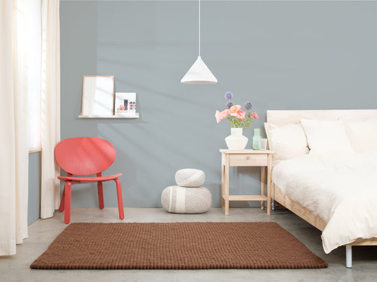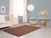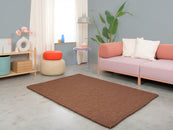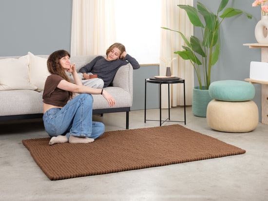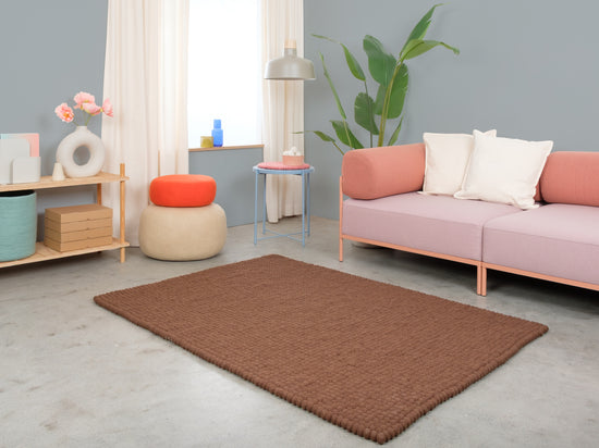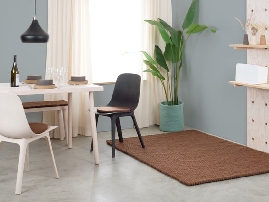 Egon går i varm chokoladebrun. Tæppet giver rummet jordforbindelse, hygge og struktur. Ideelt til læsehjørner og opholdsrum, der må få mere varme. Slidstærkt, formstabilt og behageligt at gå på. Håndlavet i Nepal – 100 % ren ny uld.