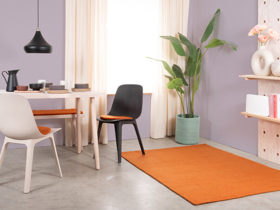 Afra bringer en varm orange ind i rummet. Indbydende og energisk uden at blive dominerende. Perfekt til at varme kølige rum op eller sætte accenter. Robust, let at pleje og behageligt under fødderne. Håndlavet i Nepal – af 100 % ren ny uld.