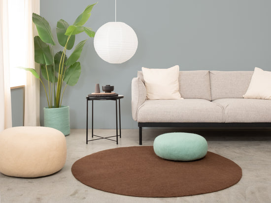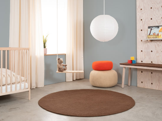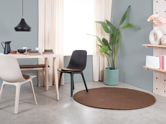 Egon går i varm chokoladebrun. Tæppet giver rummet jordforbindelse, hygge og struktur. Ideelt til læsehjørner og opholdsrum, der må få mere varme. Slidstærkt, formstabilt og behageligt at gå på. Håndlavet i Nepal – 100 % ren ny uld.