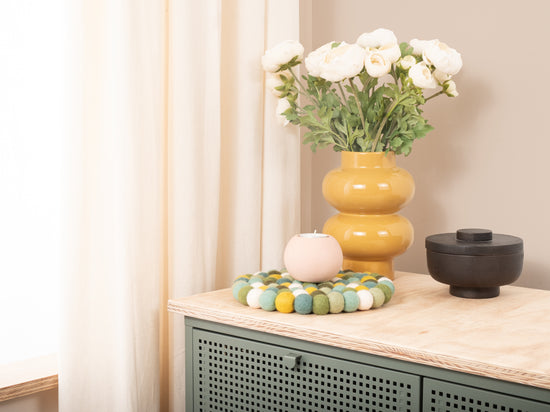 Grydelappen Finn i farven flerfarvet kombinerer funktion med et charmerende udseende. Robust, varmebestandig, vand- og smudsafvisende samt vendbar. Fremstillet af ren nyuld, håndlavet i Nepal under fair forhold.