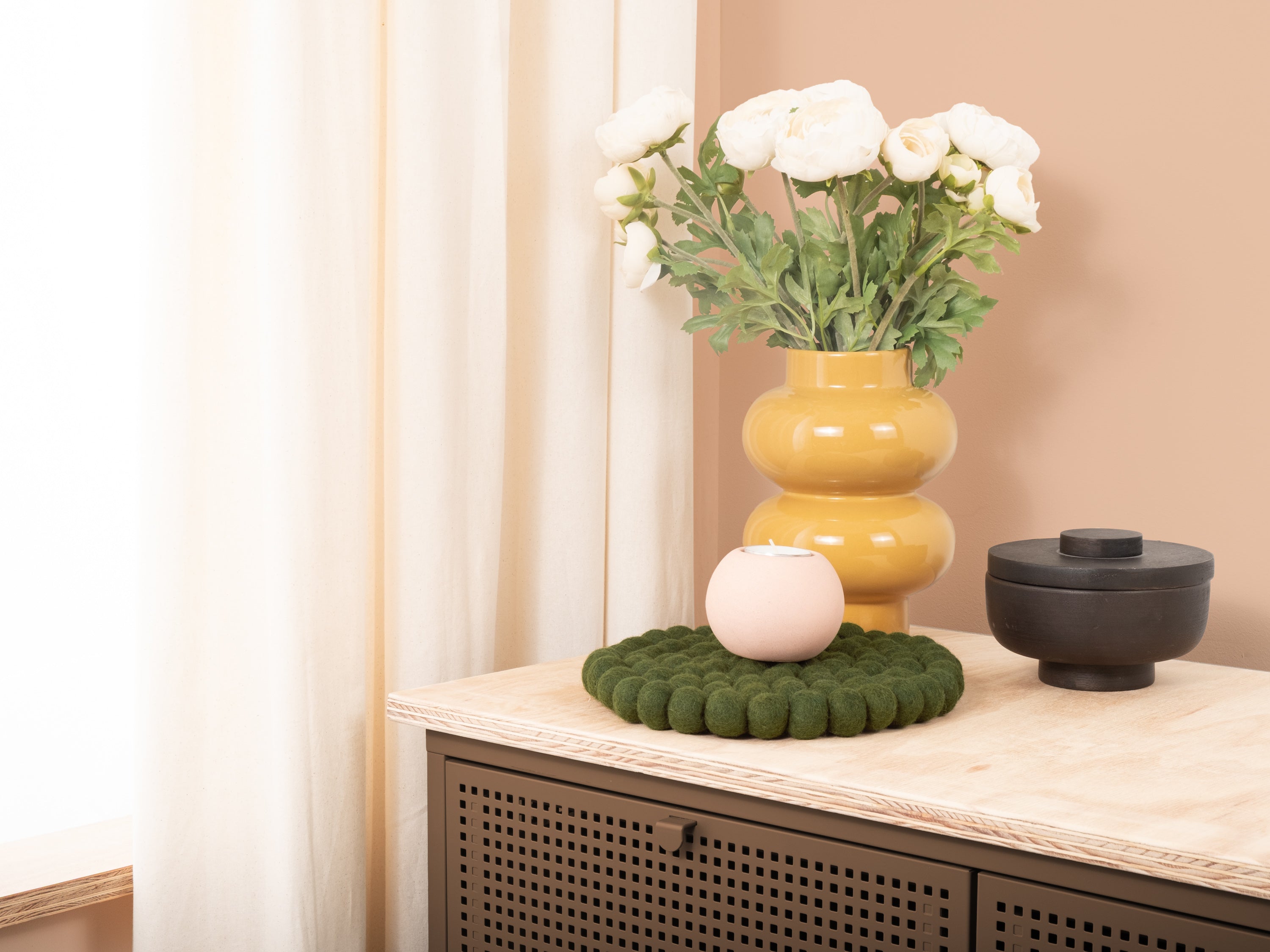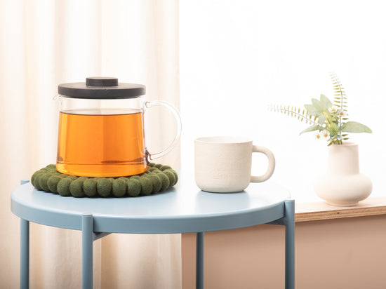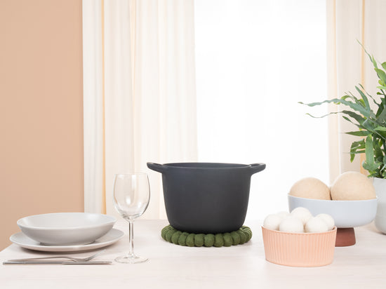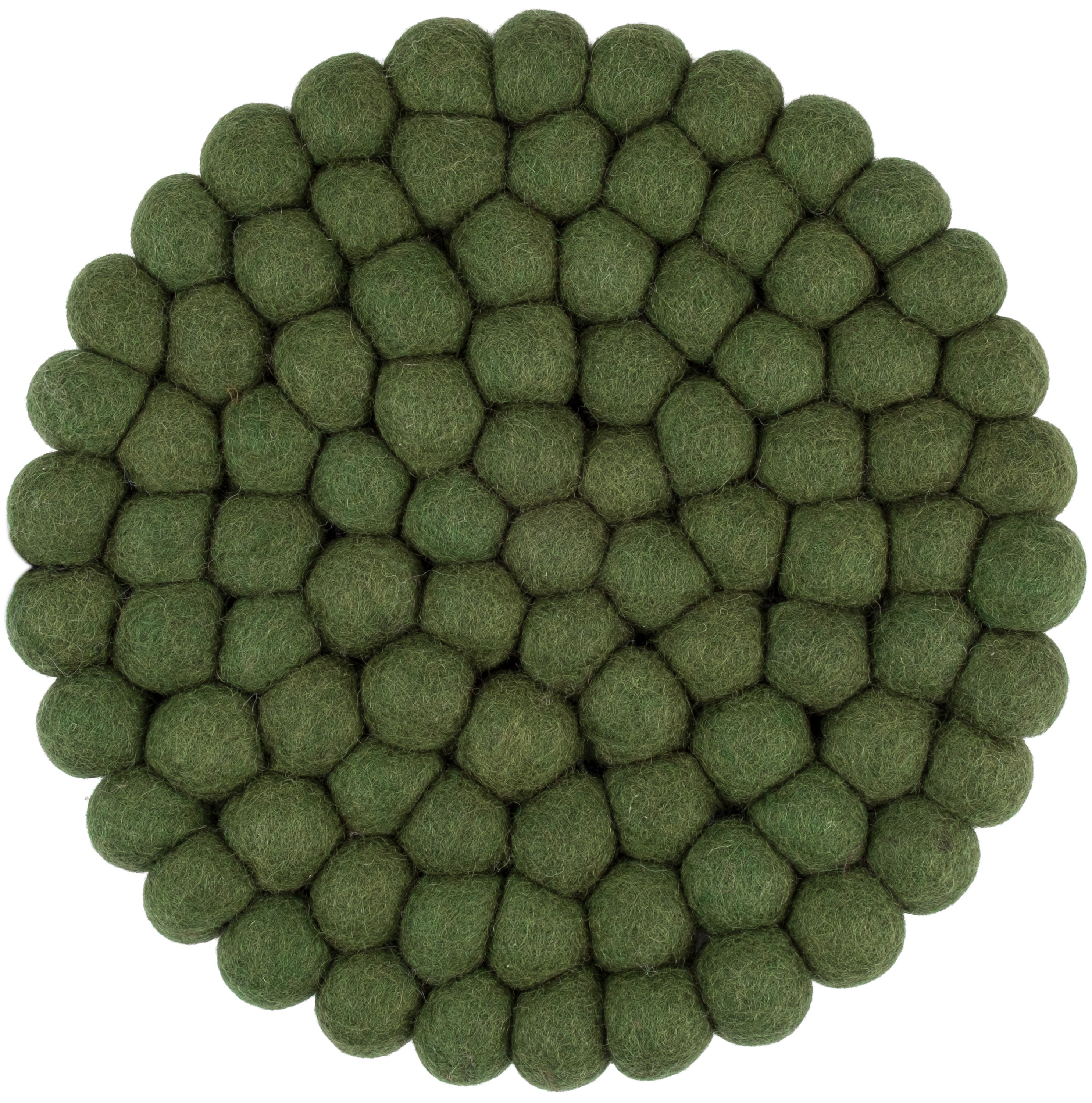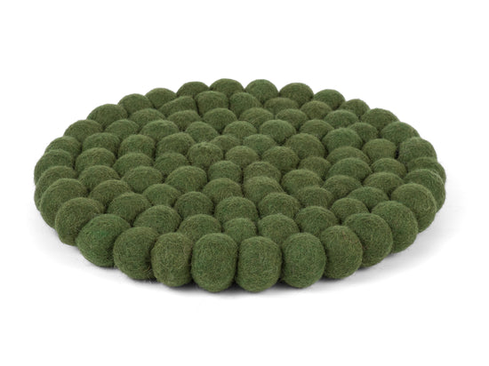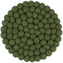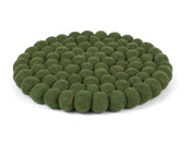 Rund, mørkegrøn grydeunderlag af ren uld