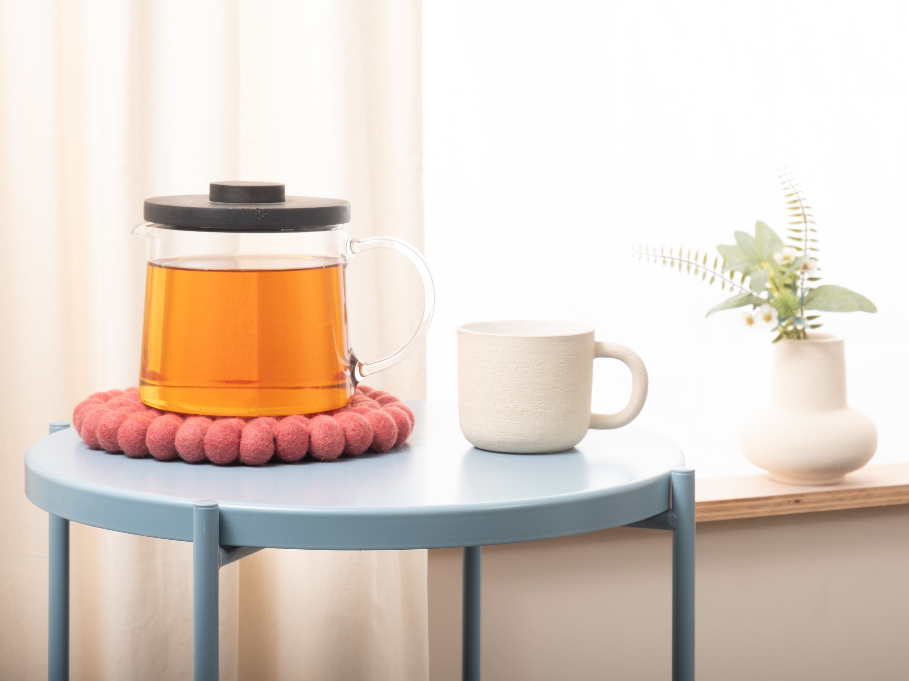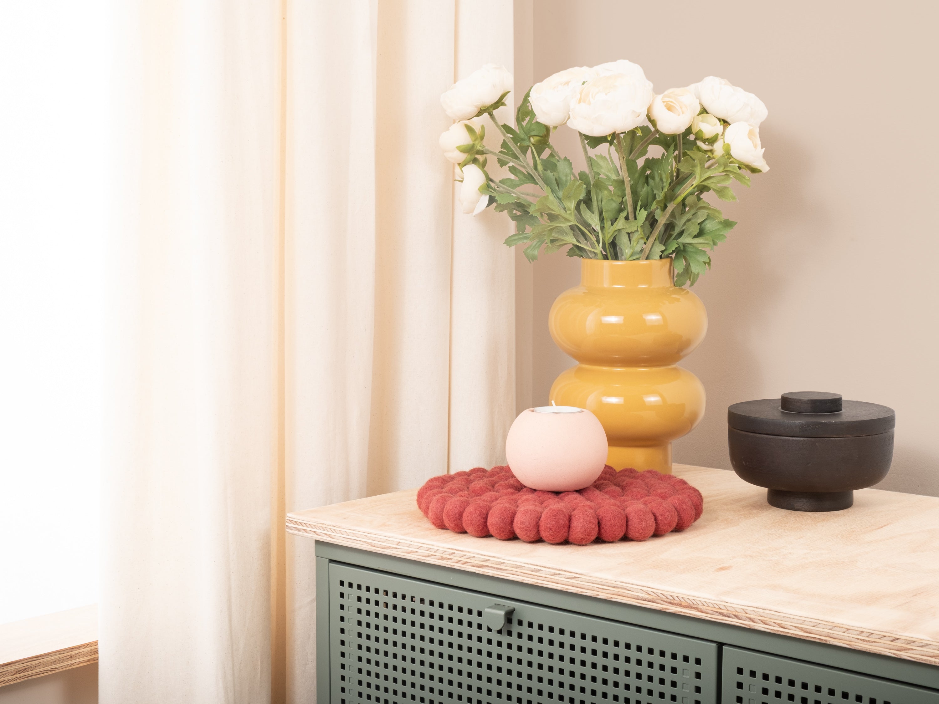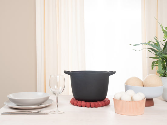 Grydelappen Kaja i farven vinrød kombinerer funktion med et charmerende udseende. Robust, varmebestandig, vand- og smudsafvisende samt vendbar. Fremstillet af ren nyuld, håndlavet i Nepal under fair forhold.