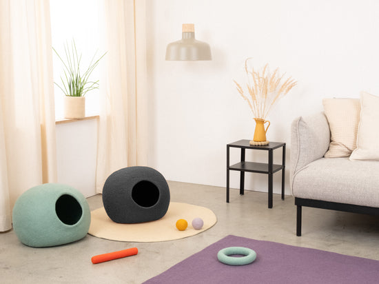 I hulen håndlavet af ren ny uld føler store og små katte sig godt tilpas og trygge. Det bæredygtige materiale er let at pleje, hygiejnisk og antibakterielt takket være det naturlige uldfedt. Uldfilt har antistatiske egenskaber og er temperaturregulerende. Filthulen er varm og behagelig om vinteren og behagelig kølig om sommeren.