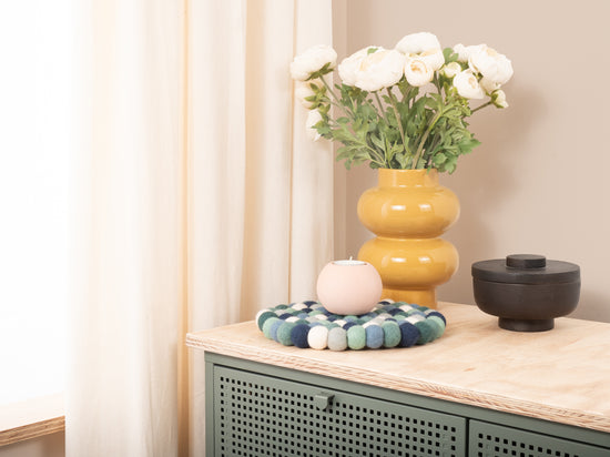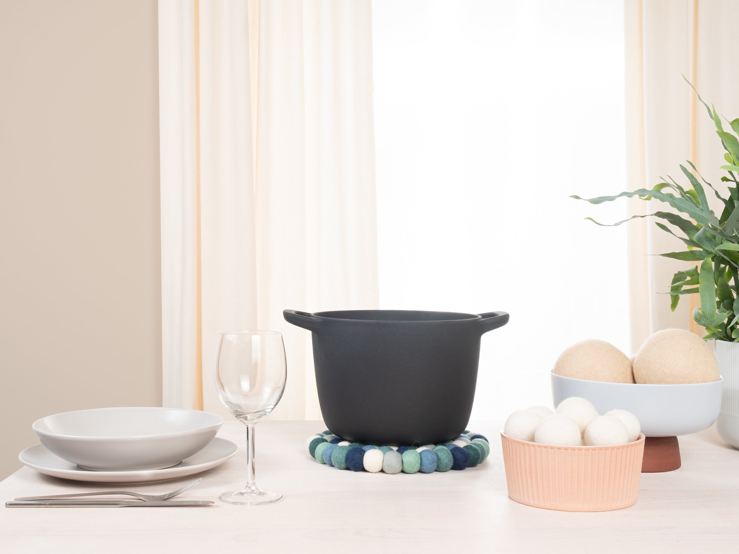 Grydelappen Mare i farven flerfarvet kombinerer funktion med et charmerende udseende. Robust, varmebestandig, vand- og smudsafvisende samt vendbar. Fremstillet af ren nyuld, håndlavet i Nepal under fair forhold.