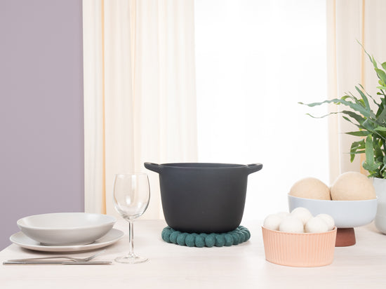 Grydelappen Noah i farven petrol kombinerer funktion med et charmerende udseende. Robust, varmebestandig, vand- og smudsafvisende samt vendbar. Fremstillet af ren nyuld, håndlavet i Nepal under fair forhold.