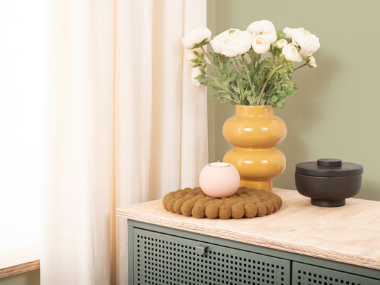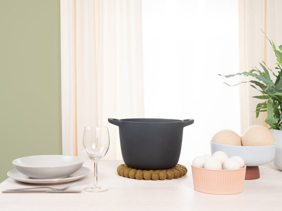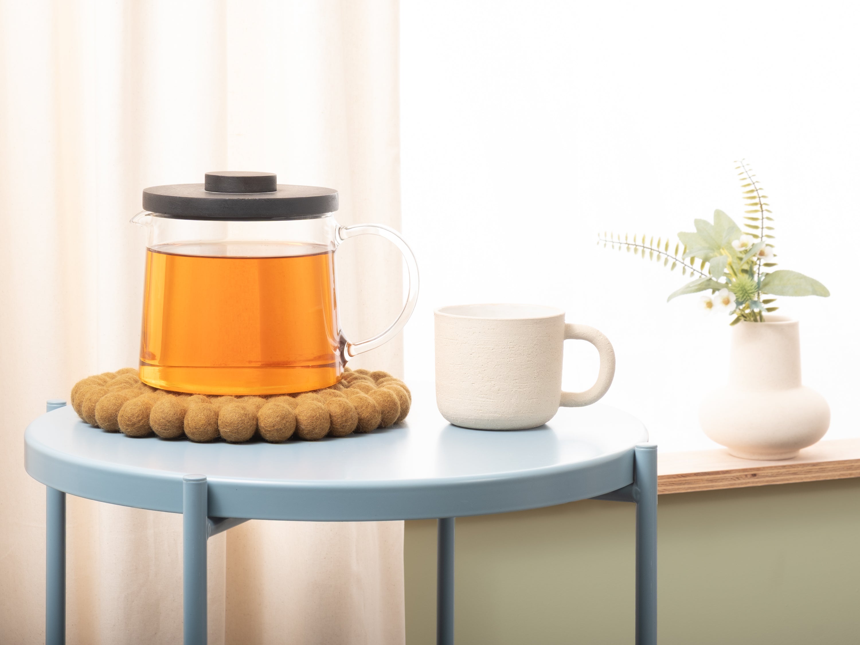 Grydelappen Omar i farven karamel kombinerer funktion med et charmerende udseende. Robust, varmebestandig, vand- og smudsafvisende samt vendbar. Fremstillet af ren nyuld, håndlavet i Nepal under fair forhold.