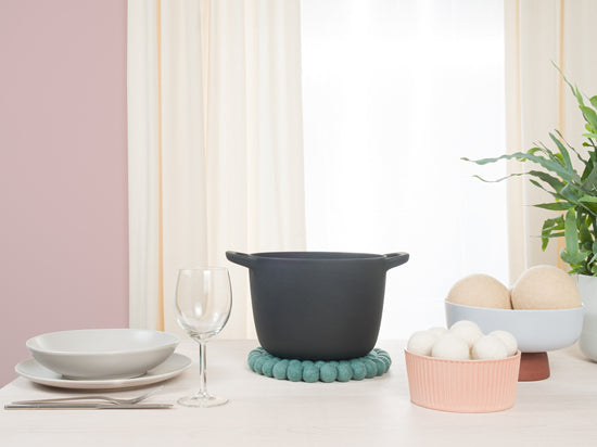 Grydelappen Taro i farven aqua kombinerer funktion med et charmerende udseende. Robust, varmebestandig, vand- og smudsafvisende samt vendbar. Fremstillet af ren nyuld, håndlavet i Nepal under fair forhold.